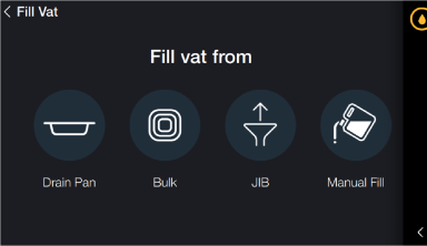 JIB - Tap JIB then tap and hold Fill to fill the vat from the JIB, for an understanding of fill indicators. Select Done when finished.