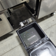 - Open center door and pull the filter pan assembly from under fryer and replace with oil discard shuttle.